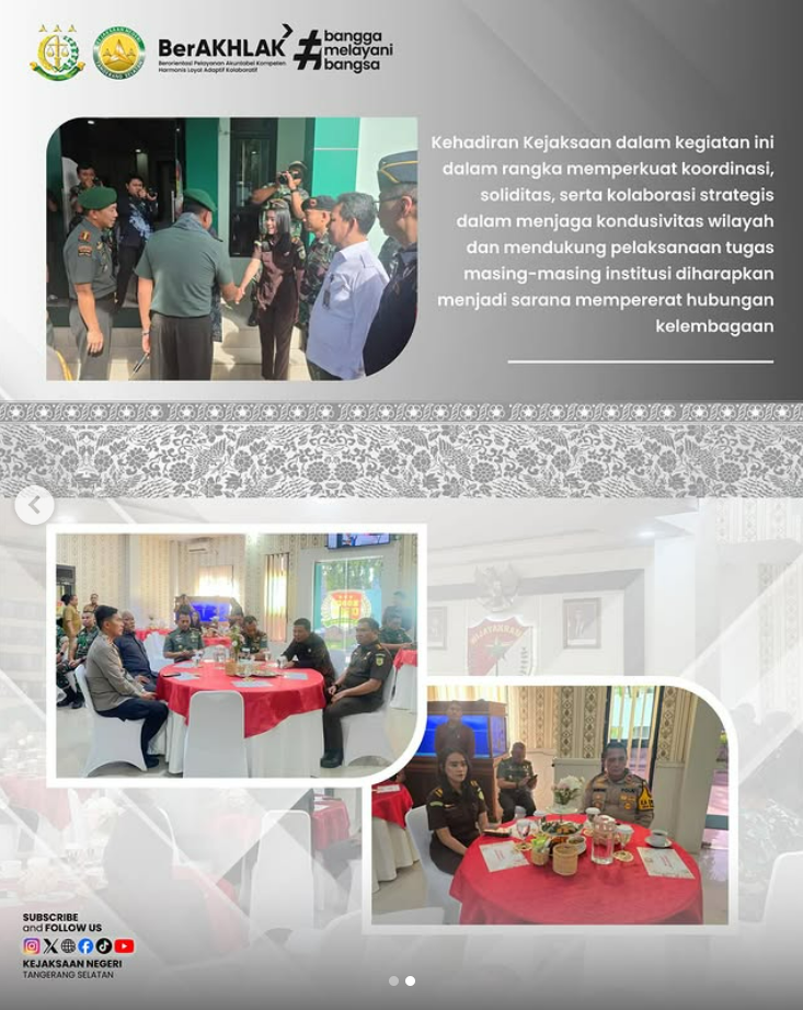 Kepala Kejaksaan Negeri Tangerang Selatan yang diwakili oleh Ajun Jaksa Madya Rosdayana Khairuummah, S.H., M.H. hadir sebagai salah satu tamu undangan pada kegiatan Penyambutan Komandan Resor Militer 052/Wijayakrama yang melakukan kunjungan kerja di wilayah teritorial Komandan 0506/Tangerang.