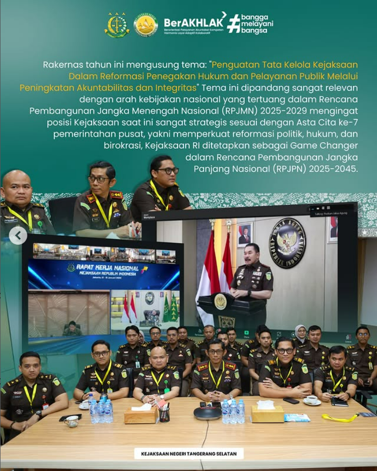 Kepala Kejaksaan Negeri Tangerang Selatan, Apreza Darul Putra, S.H., M.H. beserta para Kepala Seksi, Kepala Sub Bagian dan Jajaran mengikuti Rapat Kerja Nasional (RAKERNAS) tahun 2026 secara Daring, di Ruang Rapat Kepala Kejaksaan Negeri Tangerang Selatan.
