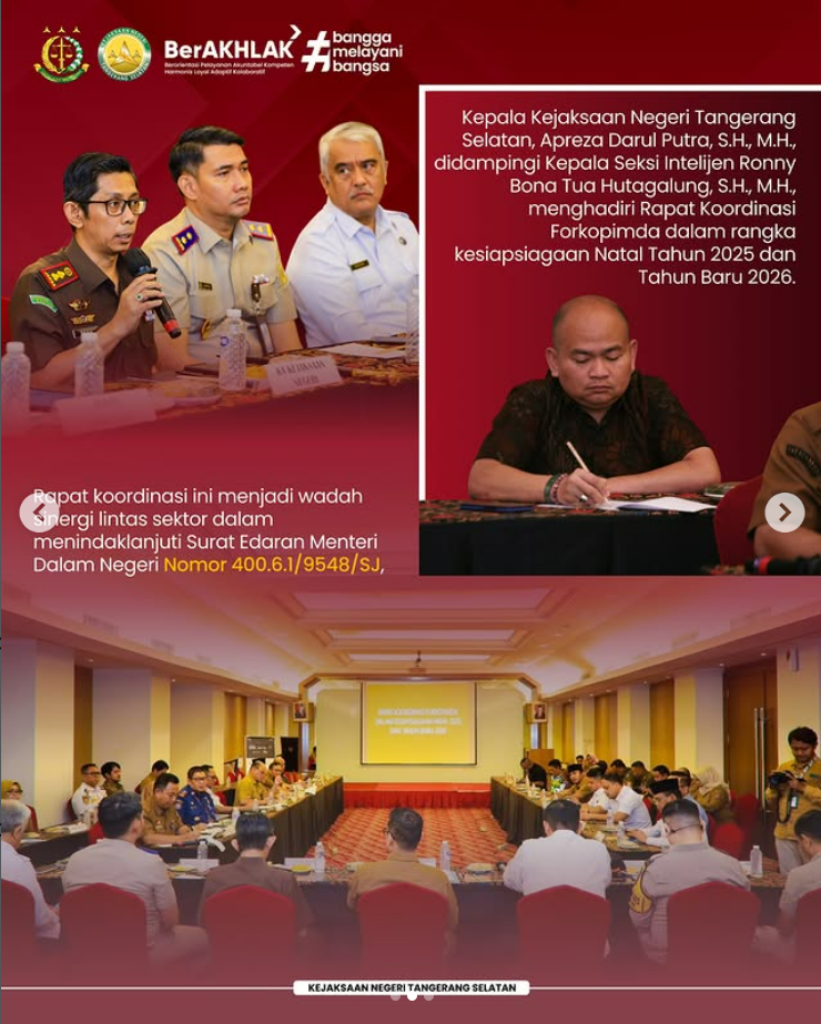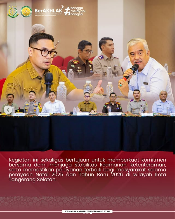 Kepala Kejaksaan Negeri Tangerang Selatan, Apreza Darul Putra, S.H., M.H., didampingi Kepala Seksi Intelijen Ronny Bona Tua Hutagalung, S.H., M.H., menghadiri Rapat Koordinasi Forkopimda dalam rangka kesiapsiagaan Natal Tahun 2025 dan Tahun Baru 2026.