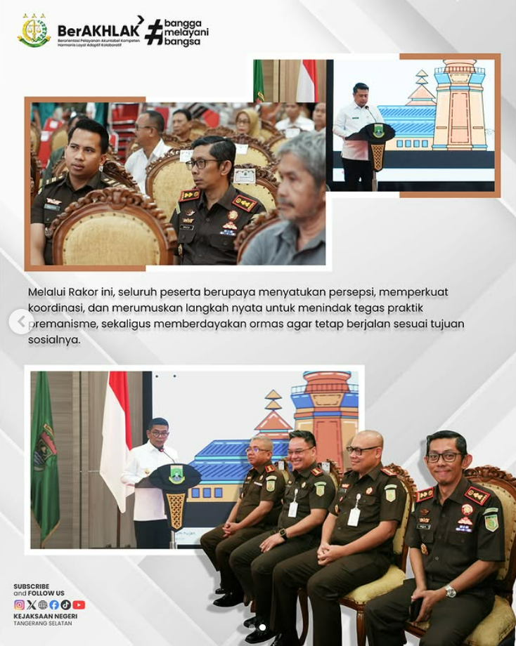 Kepala Kejaksaan Negeri Tangerang Selatan, Apreza Darul Putra, S.H., M.H., turut hadir dalam kegiatan Rapat Koordinasi Tim Terpadu Pengawasan Ormas Tahun 2025 yang mengusung tema “Penguatan Sinergi Pengawasan Ormas dan Organisasi Politik dalam Menjaga Keamanan, Iklim Investasi, dan Stabilitas Ekonomi Nasional.” Bertempat di Ruang Rapat Pendopo Gubernur Banten.