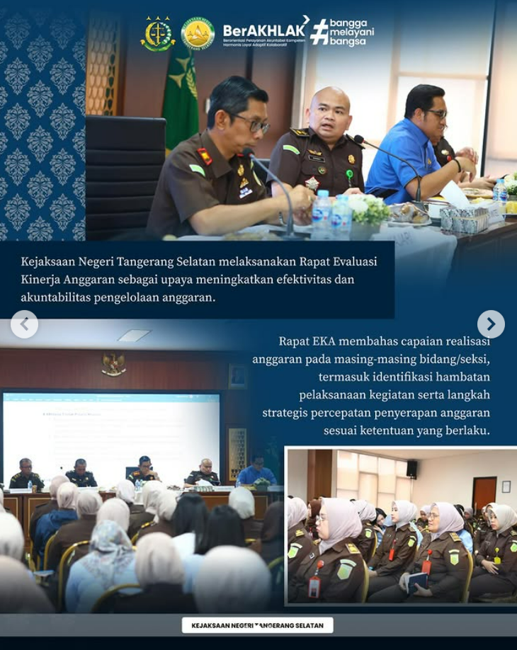 Kejaksaan Negeri Tangerang Selatan melaksanakan Rapat Evaluasi Kinerja Anggaran (EKA) sebagai upaya meningkatkan efektivitas dan akuntabilitas pengelolaan anggaran. Rapat ini membahas capaian realisasi anggaran pada setiap bidang/seksi, sekaligus mengidentifikasi hambatan pelaksanaan kegiatan serta merumuskan langkah strategis percepatan penyerapan anggaran sesuai ketentuan yang berlaku.