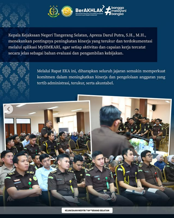 Kepala Kejaksaan Negeri Tangerang Selatan, Apreza Darul Putra, S.H., M.H., menekankan pentingnya kinerja yang terukur dan terdokumentasi melalui aplikasi MySIMKARI agar seluruh aktivitas dan capaian kerja tercatat secara jelas sebagai bahan evaluasi dan pengambilan kebijakan. Melalui Rapat EKA ini, diharapkan seluruh jajaran semakin memperkuat komitmen dalam mewujudkan pengelolaan anggaran yang tertib administrasi, terukur, dan akuntabel.
