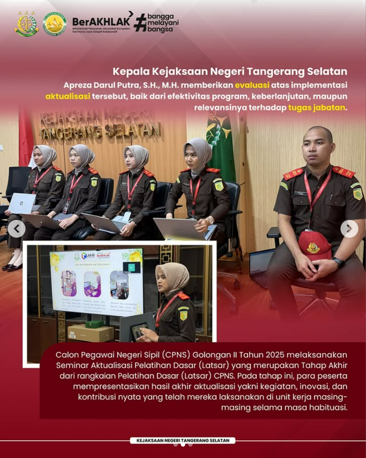 Kepala Kejaksaan Negeri Tangerang Selatan, Apreza Darul Putra, S.H., M.H. memberikan evaluasi atas implementasi aktualisasi tersebut, baik dari efektivitas program, keberlanjutan, maupun relevansinya terhadap tugas jabatan.