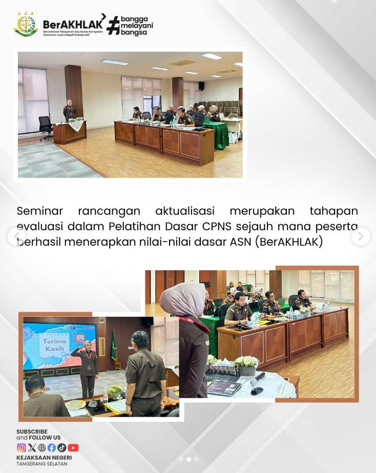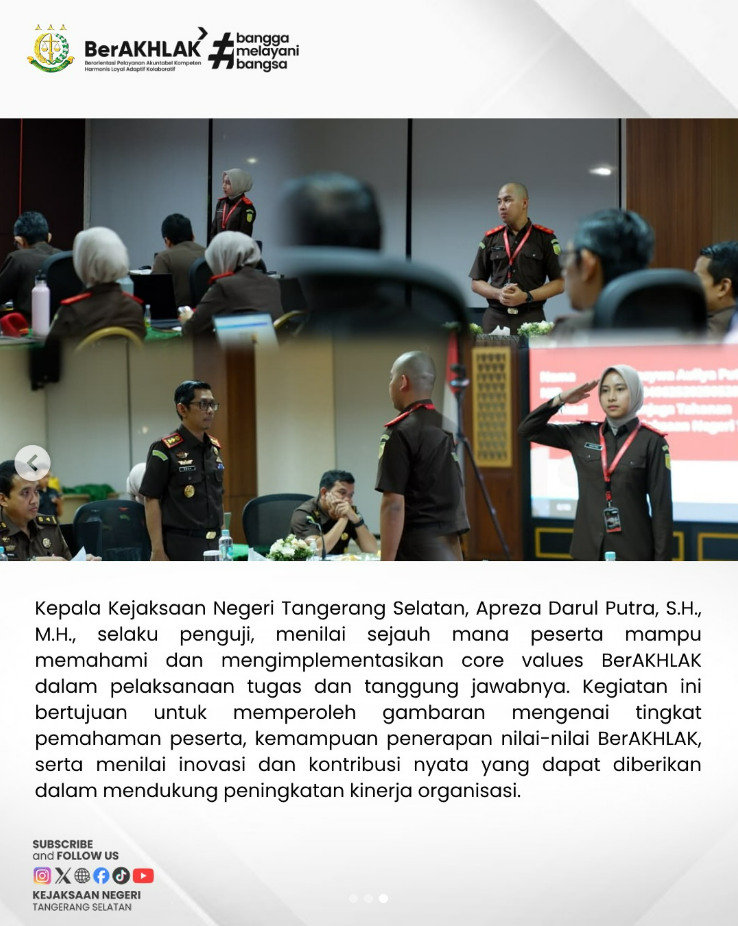 Kepala Kejaksaan Negeri Tangerang Selatan, Apreza Darul Putra, S.H., M.H., selaku penguji, menilai sejauh mana peserta mampu memahami dan mengimplementasikan core values BerAKHLAK dalam pelaksanaan tugas dan tanggung jawabnya. Kegiatan ini bertujuan untuk memperoleh gambaran mengenai tingkat pemahaman peserta, kemampuan penerapan nilai-nilai BerAKHLAK, serta menilai inovasi dan kontribusi nyata yang dapat diberikan dalam mendukung peningkatan kinerja organisasi.