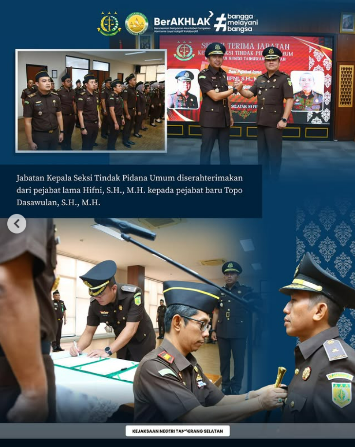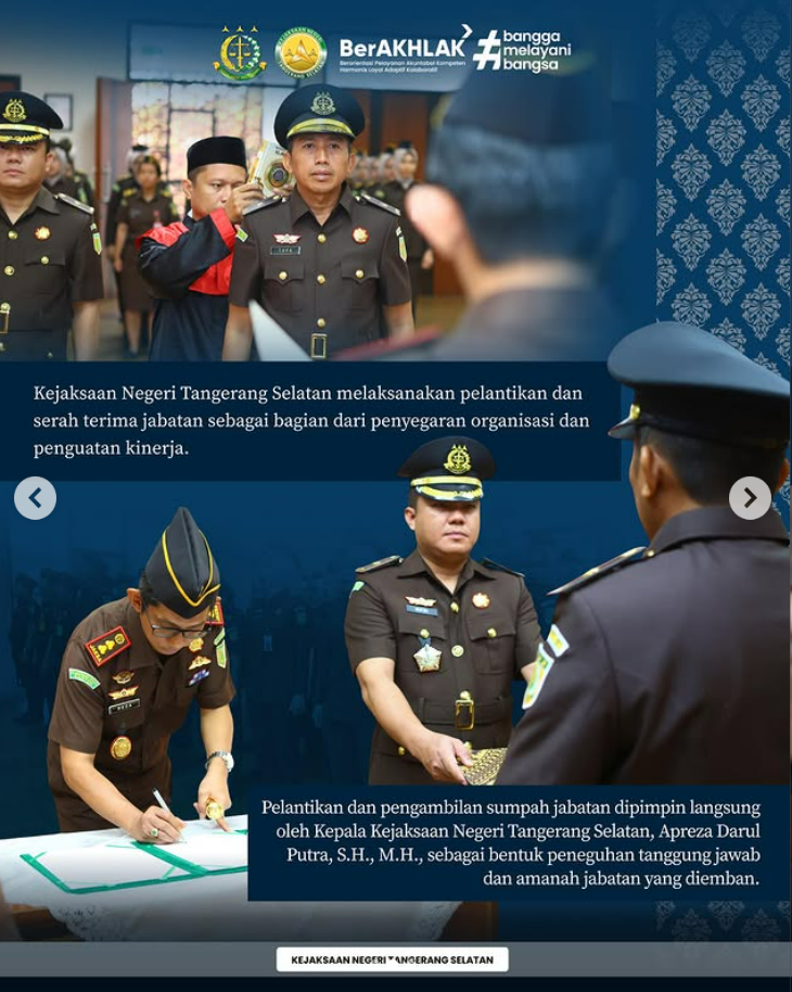 Sebagai bagian dari upaya penyegaran organisasi serta kesinambungan pelaksanaan tugas di lingkungan Kejaksaan, dilaksanakan kegiatan Serah Terima Jabatan yang dipimpin oleh Kepala Kejaksaan Negeri Tangerang Selatan, Apreza Darul Putra, S.H., M.H.