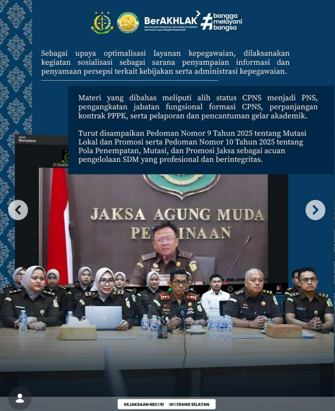 Adapun materi yang dibahas meliputi alih status CPNS menjadi PNS, pengangkatan jabatan fungsional bagi formasi CPNS, perpanjangan kontrak PPPK, serta pelaporan dan pencantuman gelar akademik. Selain itu, turut disampaikan Pedoman Nomor 9 Tahun 2025 tentang Pelaksanaan Mutasi Lokal dan Promosi serta Pedoman Nomor 10 Tahun 2025 tentang Pola Penempatan, Mutasi, dan Promosi Jaksa sebagai acuan dalam pengelolaan sumber daya manusia yang profesional.