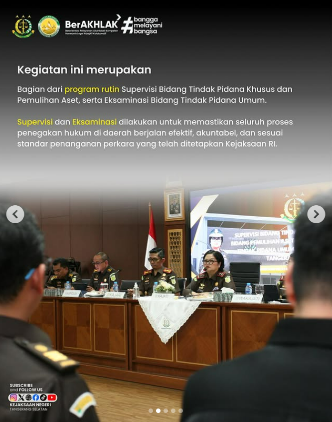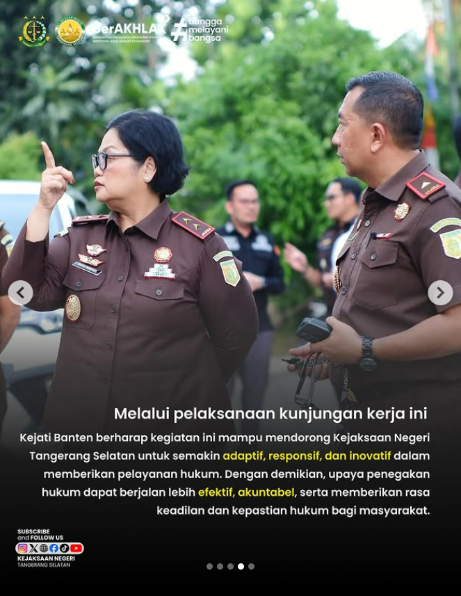 Kepala Kejaksaan Tinggi (Kajati) Banten, Bernadeta Maria Erna Elastiyani, S.H., M.H., bersama Wakil Kepala Kejaksaan Tinggi (Wakajati) Banten, Ardito Muwardi, S.H., M.H., serta jajaran pimpinan yang meliputi Asisten Tindak Pidana Umum (Aspidum), Asisten Tindak Pidana Khusus (Aspidsus), dan Asisten Pemulihan Aset (Aspema) melaksanakan kunjungan kerja ke Kejaksaan Negeri Tangerang Selatan.