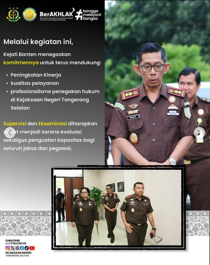 Melalui kegiatan ini, Kejati Banten menegaskan komitmennya untuk terus mendukung peningkatan kinerja, kualitas pelayanan, dan profesionalisme penegakan hukum di Kejaksaan Negeri Tangerang Selatan. Supervisi dan eksaminasi diharapkan dapat menjadi sarana evaluasi sekaligus penguatan kapasitas bagi seluruh jaksa dan pegawai.