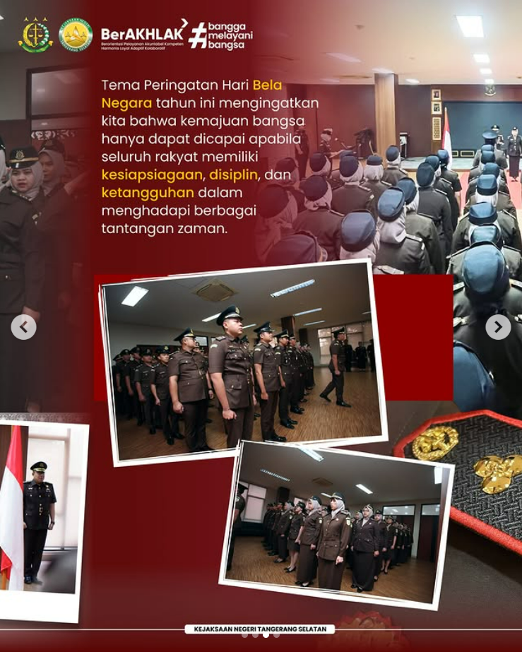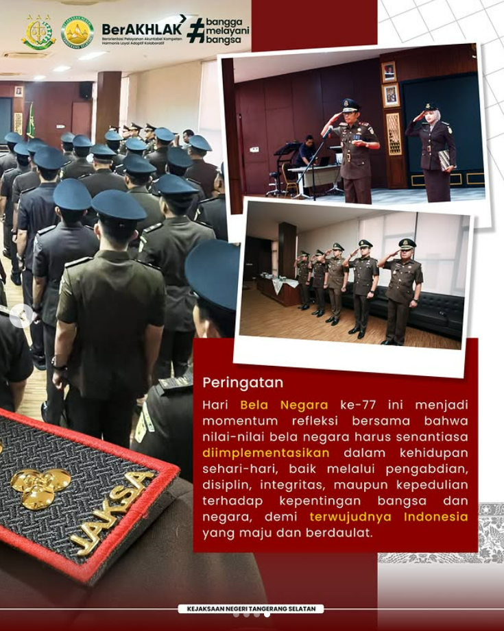 Peringatan Hari Bela Negara ke-77 ini menjadi momentum refleksi bersama bahwa nilai-nilai bela negara harus senantiasa diimplementasikan dalam kehidupan sehari-hari, baik melalui pengabdian, disiplin, integritas, maupun kepedulian terhadap kepentingan bangsa dan negara, demi terwujudnya Indonesia yang maju dan berdaulat.