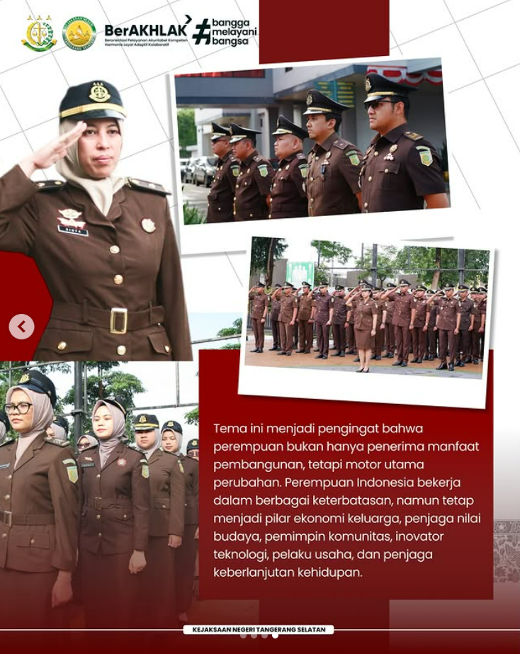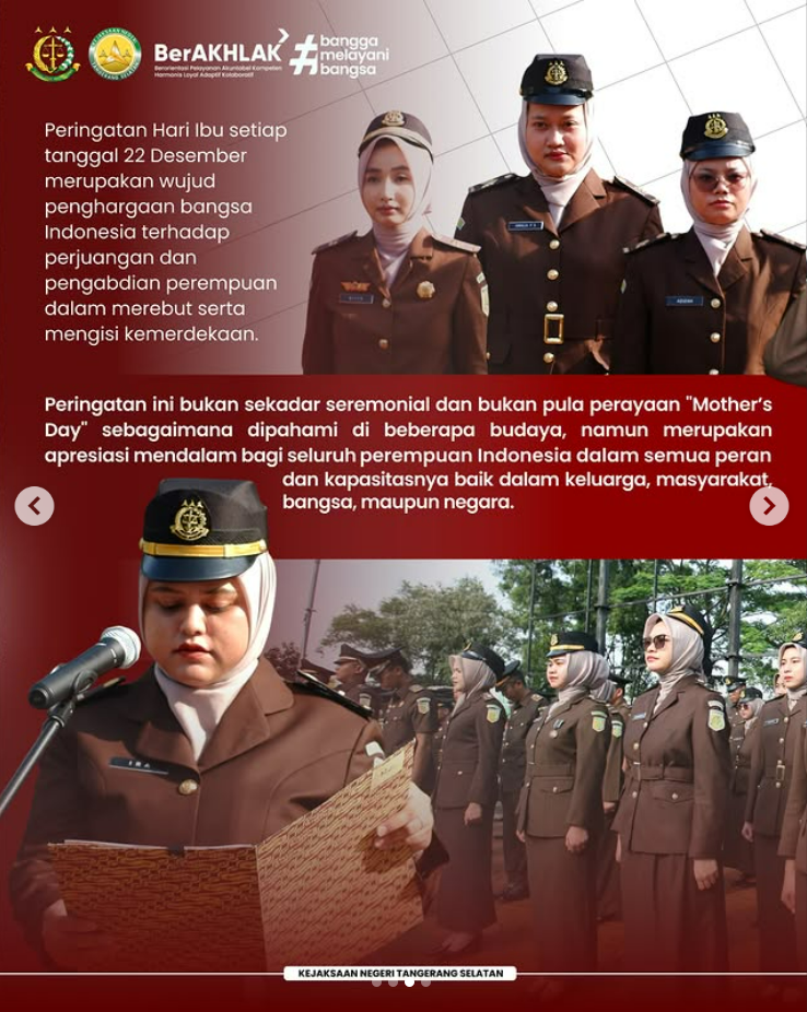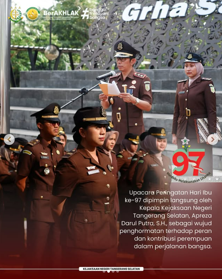 Upacara Peringatan Hari Ibu ke-97 dipimpin langsung oleh Kepala Kejaksaan Negeri Tangerang Selatan, Apreza Darul Putra, S.H., sebagai wujud penghormatan terhadap peran dan kontribusi perempuan dalam perjalanan bangsa.