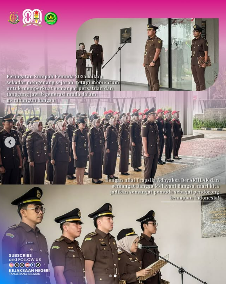 Kejaksaan Negeri Tangerang Selatan telah melaksanakan Upacara Peringatan Hari Sumpah Pemuda, 28 Oktober 2025 yang dipimpin oleh Kepala Seksi Tindak Pidana Khusus Kejaksaan Negeri Tangerang Selatan Bapak Fajar Gigih Wibowo ,S.H.,M.H bertempat di Kantor Kejaksaan Negeri Tangerang Selatan.